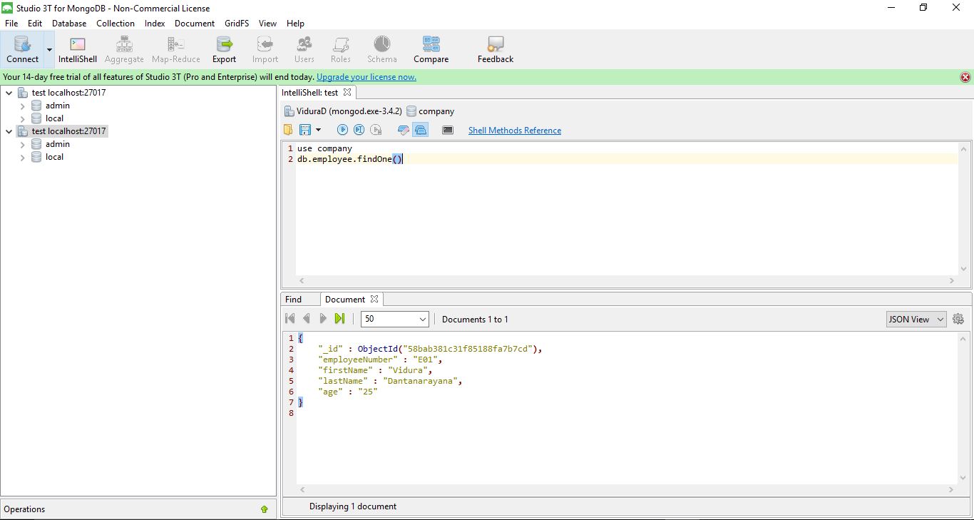 අපිට collection එකක මුල් document එක විතරක් retrieve කරන්න ඕනේ නම් findOne() command එක use කරන්න පුළුවන්.
